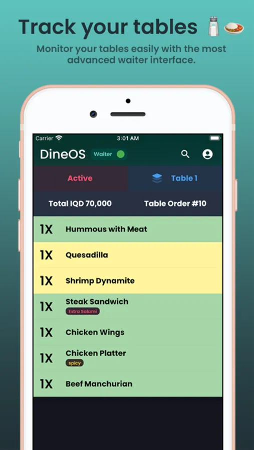 On tablets, waiters get the full convenience of in-app order management and the flexibility of a full-scale DineOS menu.