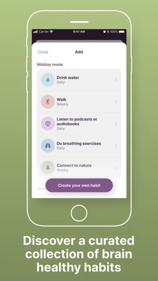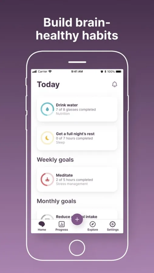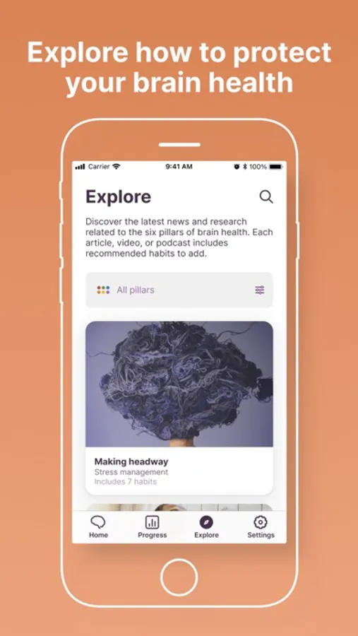 · Guides users to healthy habits based on all Six Pillars of Brain Health: Exercise, Nutrition, Stress Management, Social Activity, Mental Stimulation, and Sleep