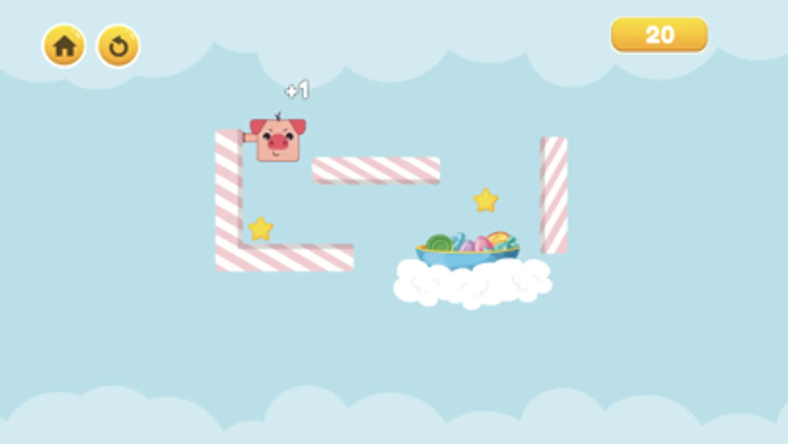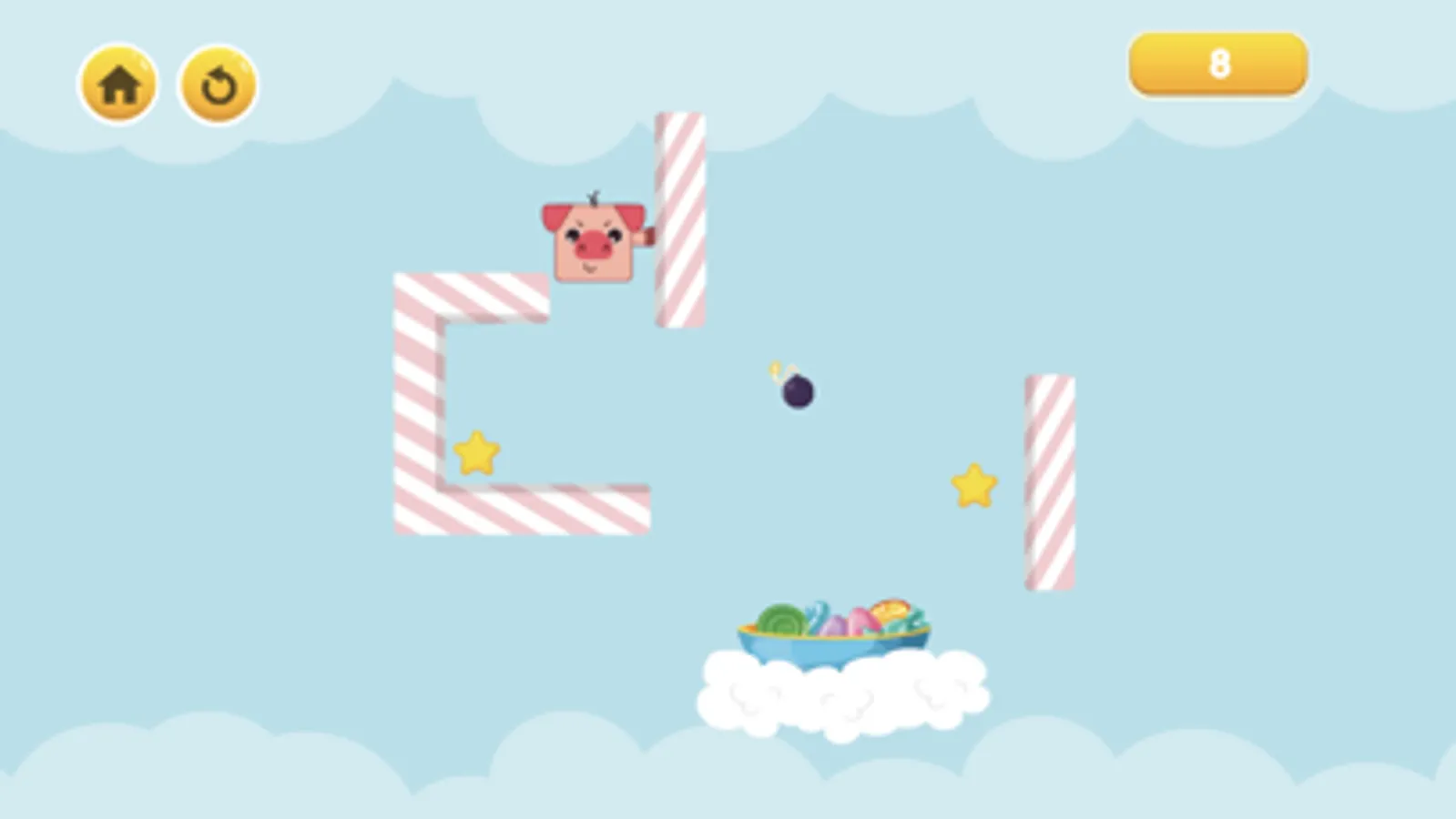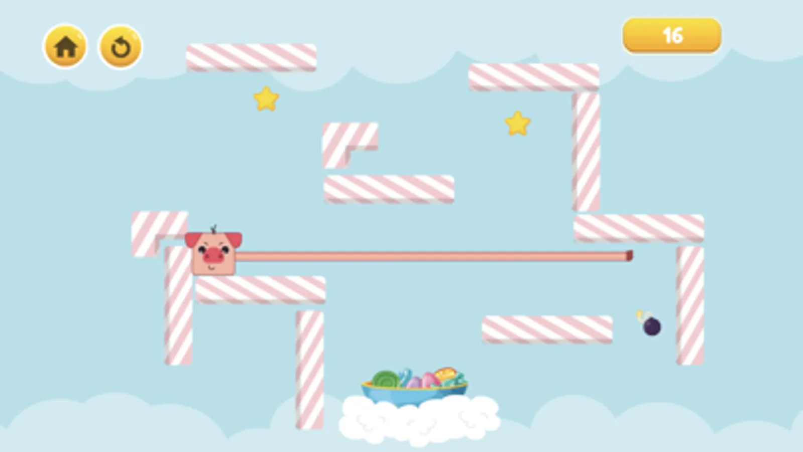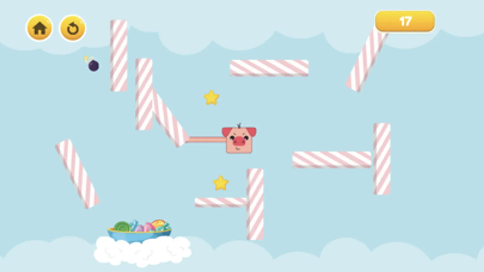 Touch the candy bars to help the pig move to the candy plate, sometimes the candy bar will soften and the pig's hand can go through the candy bar and get stuck, skillfully touch the edge of the candy bar to cling and touch on the pig to fall down and avoid the bomb.