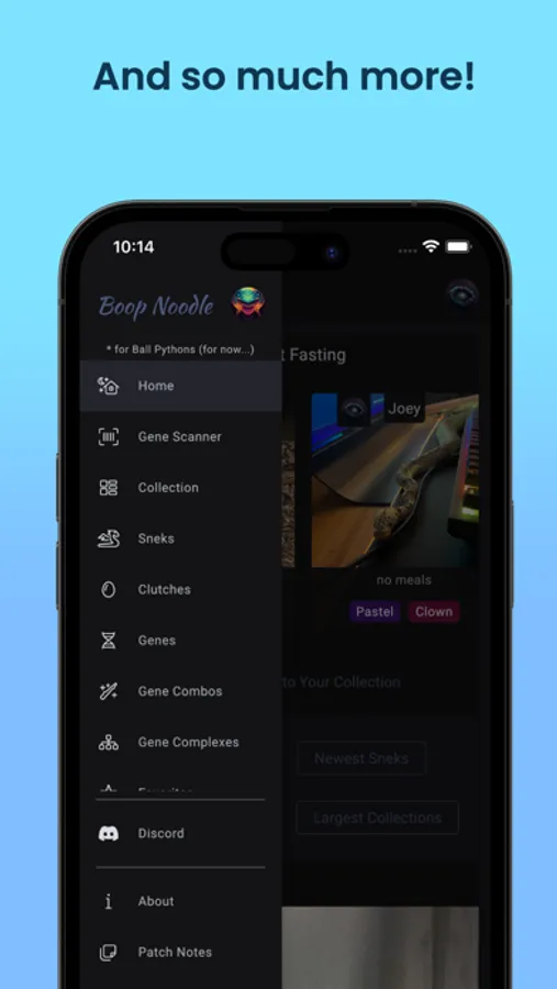 Boop Noodle helps you track your ball python collection and explore the rapid expansion of genetic outcomes. Use our AI Gene Scanner, Breeding Calculator, and other collection management features while sharing your snakes with other keepers from around the world!