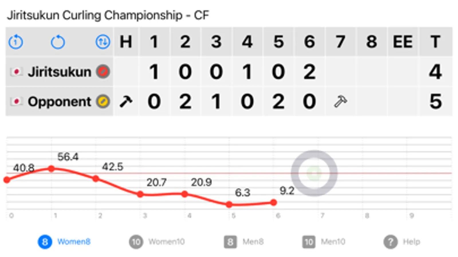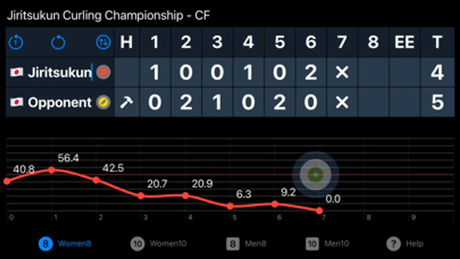 本アプリは、カーリングのスコアと期待勝率遷移グラフを連動して同時に表示するアプリです。過去に行われたトップチームの試合を2,000試合以上の得点経過を分析して、残りエンド数と得点差、次のエンドの先攻・後攻の情報から実際にいくつの試合で勝ったのかにもとづいて、期待勝率を算出しています。