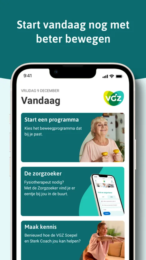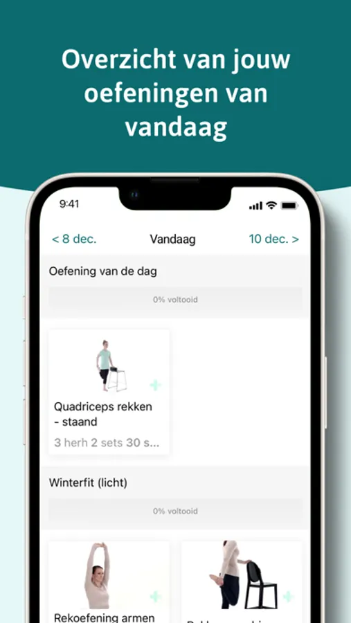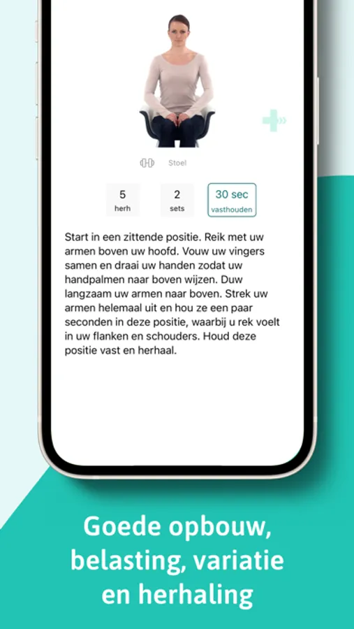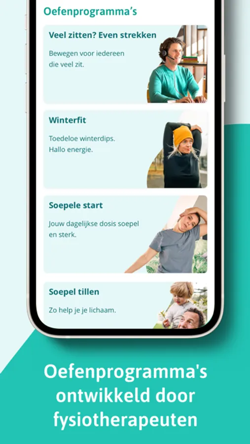 Gratis app die helpt bij beter bewegen. Vol met oefenprogramma’s ontwikkeld door fysiotherapeuten. Die helpen om thuis oefeningen te doen voor je rug, schouders of nek. En zo klachten aan bijvoorbeeld nek en schouder te voorkomen. Voor iedereen die meer wil bewegen of de dag gewoon lekker wil beginnen. En heb je een zittend beroep? Of juist een zwaar beroep? Dan zijn er speciale beweegprogramma’s voor jou. Geef je lichaam het grootste cadeau: beweging.