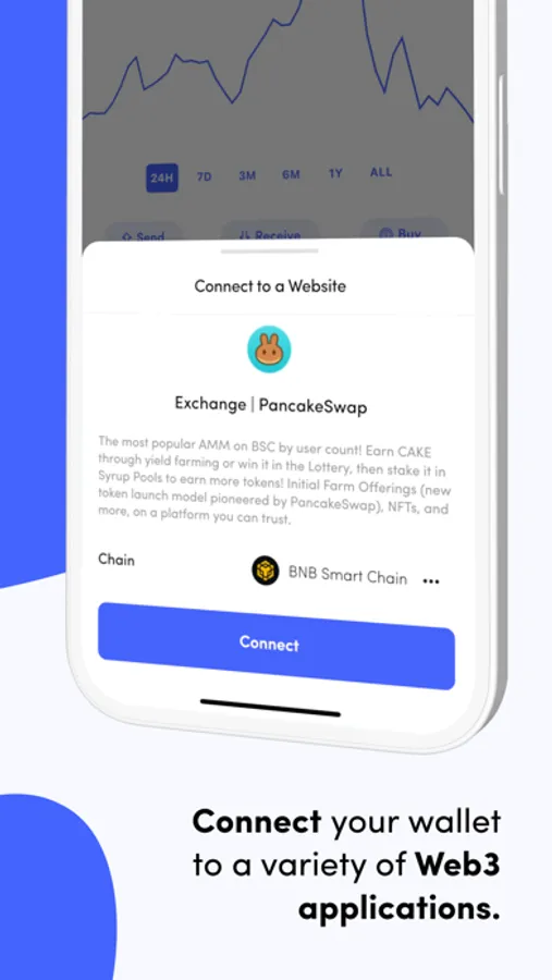 Connect to Decentralised Applications (Uniswap, Pancakeswap, 1Inch) using Wallet Connect.