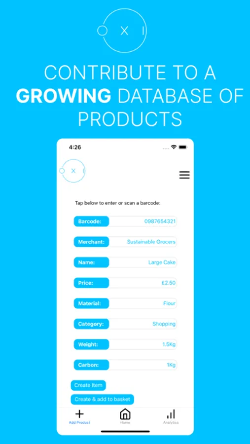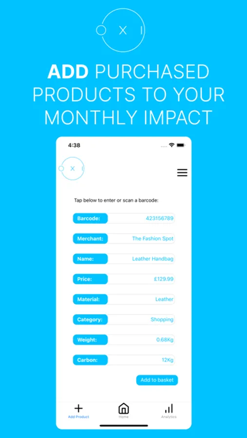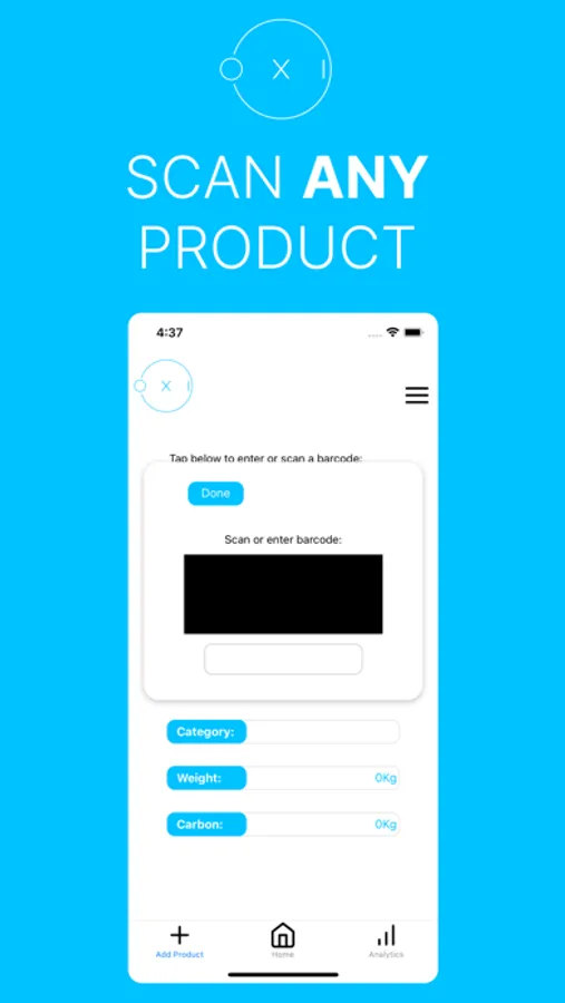 Welcome to Oxi - the easiest way to track and reduce your carbon footprint! With Oxi, you can scan the barcodes of the products you buy and input information such as the weight and material of the product. Oxi then calculates the estimated carbon footprint of the product and adds it to your "basket."