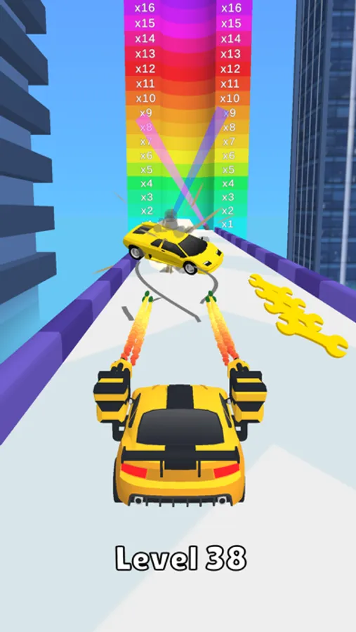 Collect wrenches and shoot lower-level cars to level up!!