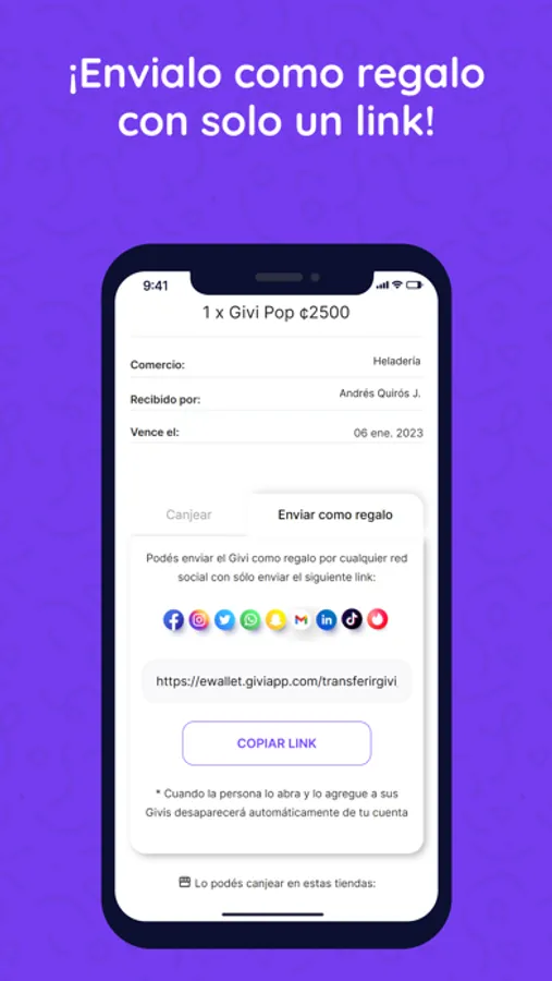 VOS ESCOGÉS: SMS, Email, WhatsApp, Messenger, Telegram, Instagram, BeReal, Facebook, Tinder, Grindr, Bumble, Slack, Teams, Google Meet, etc. Si tu red social permite enviar texto, entonces Givi te deja enviar y recibir tantos regalos como querás de tus comercios favoritos