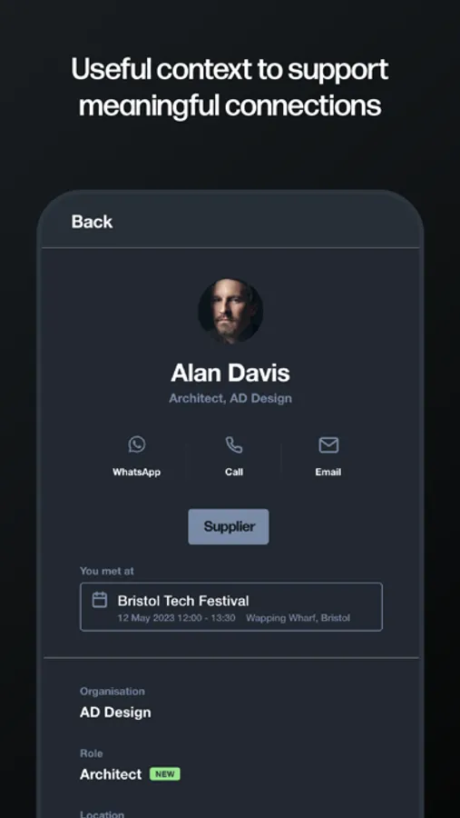 - Automatically overlay relevant information on your contacts. Where and when did you meet? What are your areas of specialism? How might you help one another?