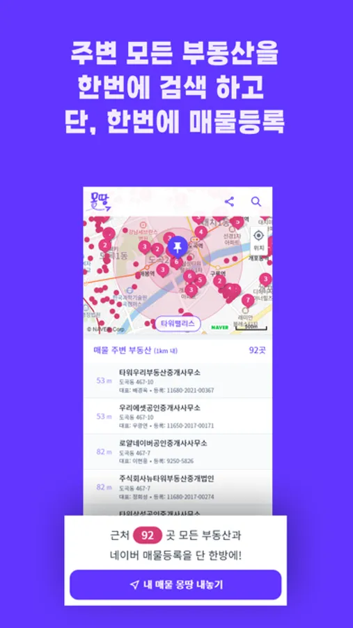 사용자의 매물(매매/전세/월세) 소재지 주변 부동산에 일일히 전화하며 등록하는 번거로움을 해소해 드립니다. 본 앱은 사용자 매물 위치를 기반으로 선택반경에 부동산을 자동 검색하고, 해당 부동산들에 문자메시지를 통해 일괄로 매물을 한번에 등록할 수 있도록 지원하는 서비스입니다.