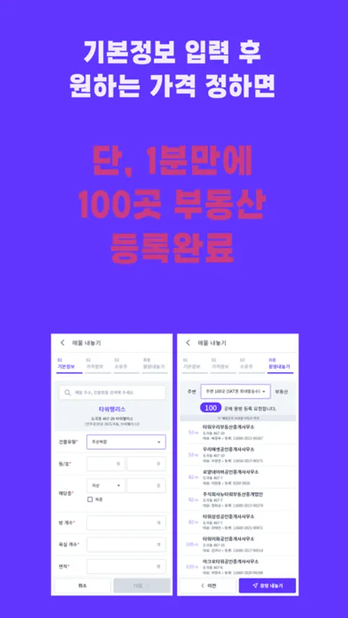 단, 10초 만에 내 매물 주변의 수많은 부동산(ex. 100군데 부동산)에 매물 등록 메시지를 전송해 보세요.