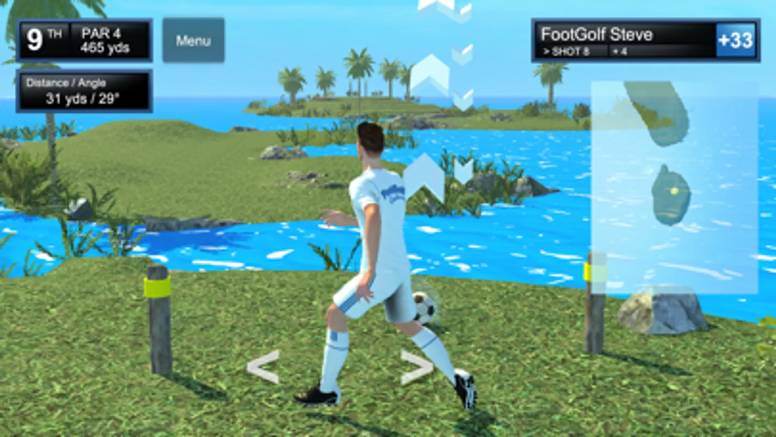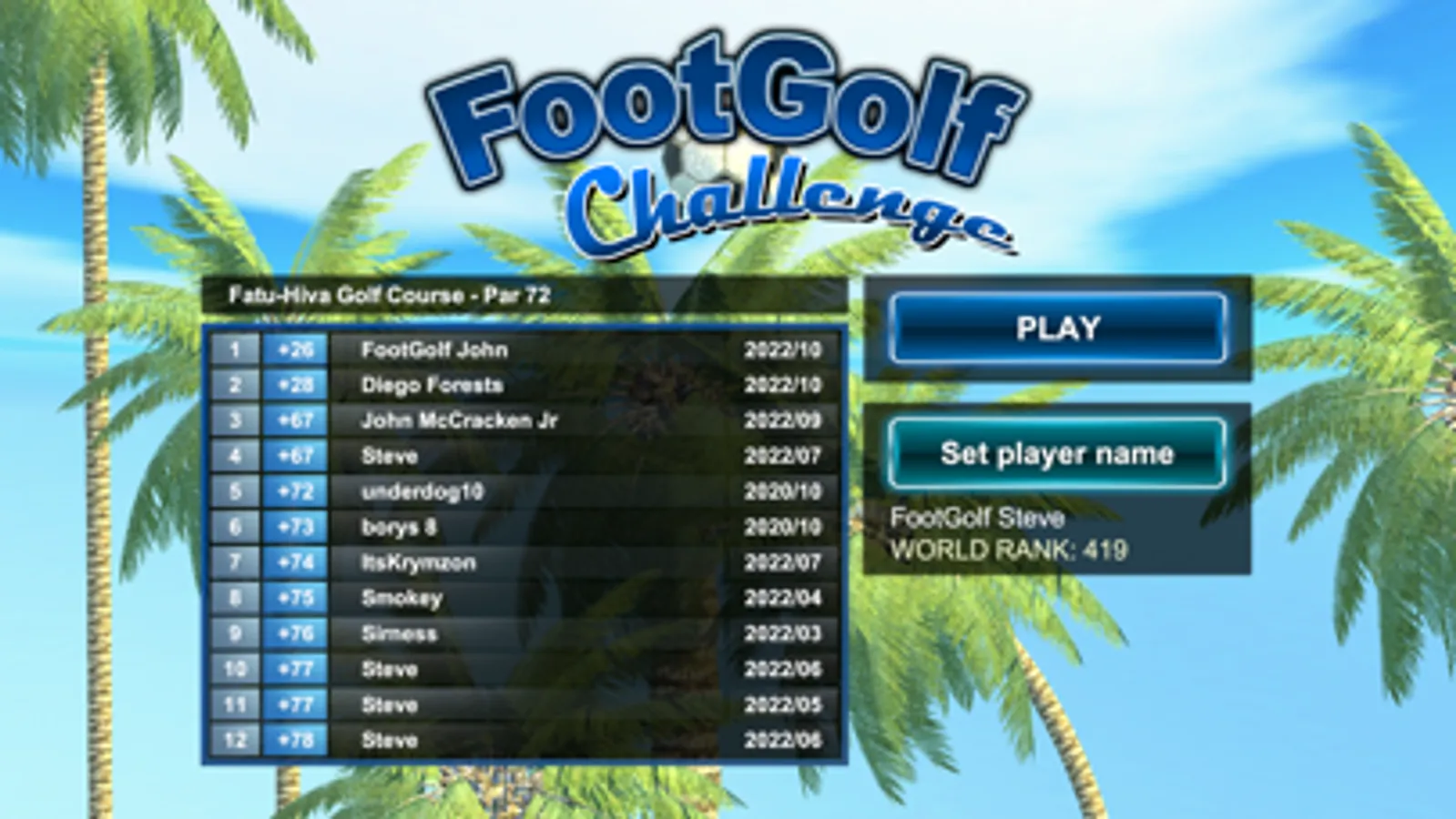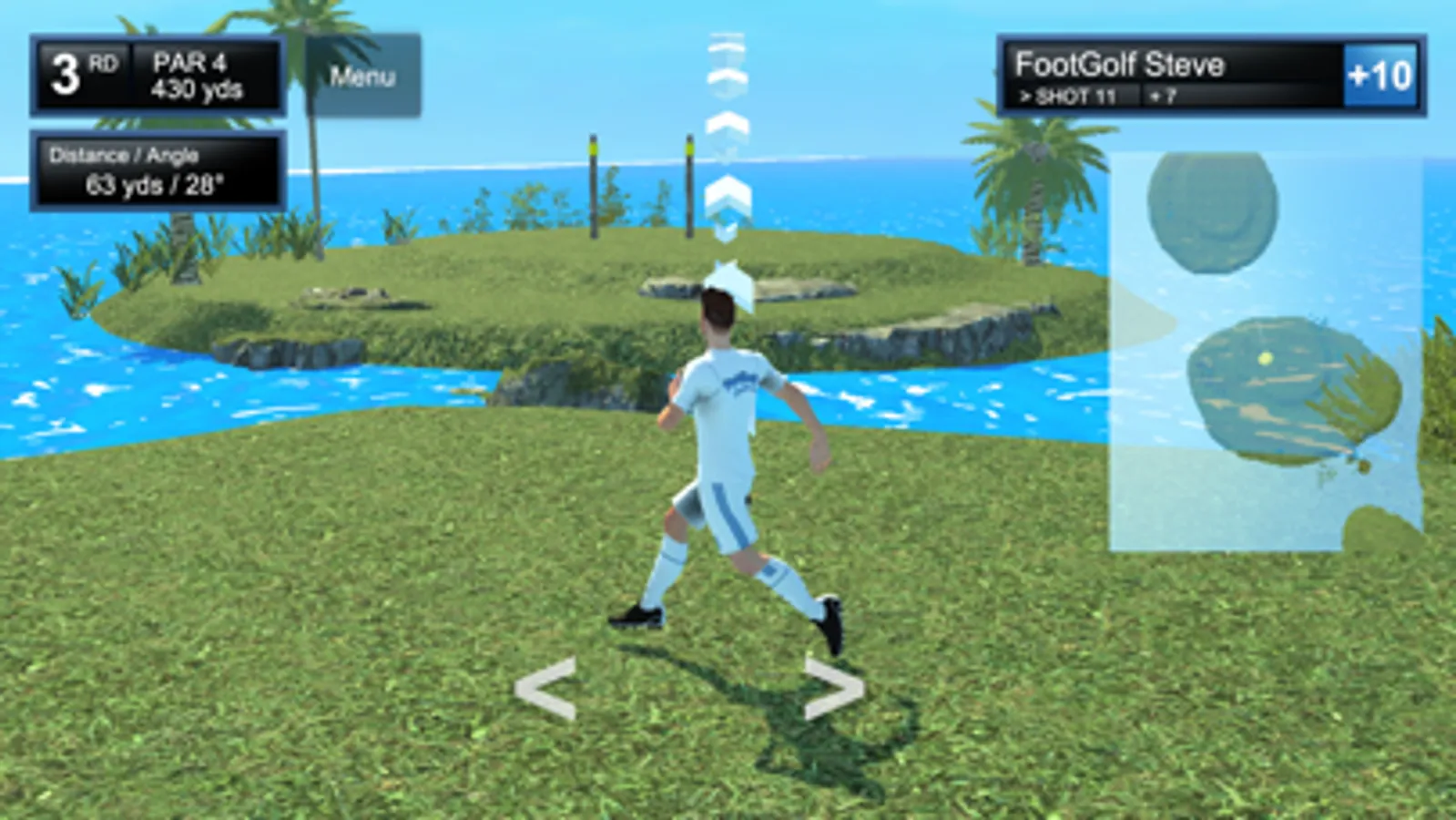 Footgolf is a sport in which players kick a football into a cup or a goal in as few shots as possible. FootGolf Challenge uses a simplified set of rules, where you just need to stay clear of water to avoid penalties. The whole course is par 72, which means the best players need 72 shots to finish it. If you manage to play better than that, you can make it to the global top 12 chart. Good luck!