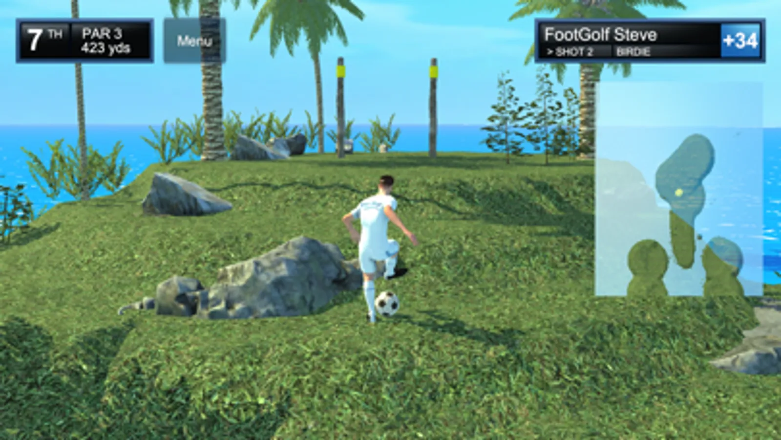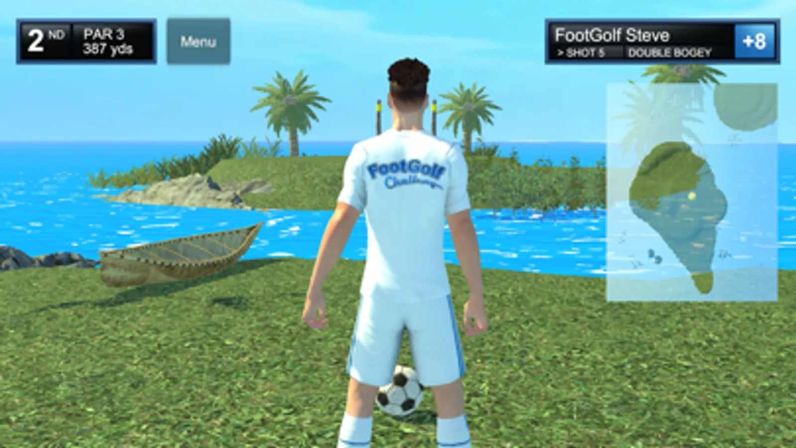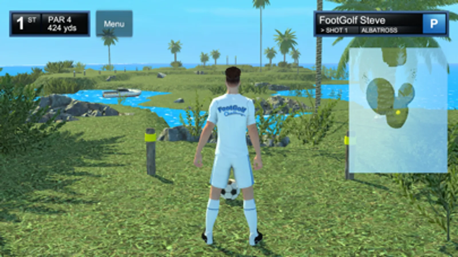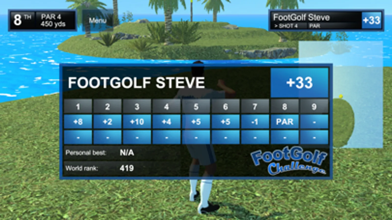 Footgolf is a sport in which players kick a football into a cup or a goal in as few shots as possible. FootGolf Challenge uses a simplified set of rules, where you just need to stay clear of water to avoid penalties. The whole course is par 72, which means the best players need 72 shots to finish it. If you manage to play better than that, you can make it to the global top 12 chart. Good luck!