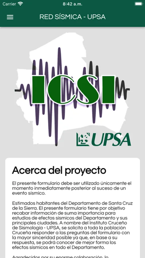 Estimados habitantes del Departamento de Santa Cruz de la Sierra. El presente formulario tiene por objetivo recabar información de suma importancia para estudios de efectos sísmicos en el Departamento y sus principales ciudades. A nombre del Instituto Cruceño de Sismología - UPSA, se solicita a toda la población Cruceña responder a las preguntas del formulario con la mayor sinceridad posible. En base a su respuesta, se podrá conocer de mejor forma los efectos sísmicos en todo el Departamento.