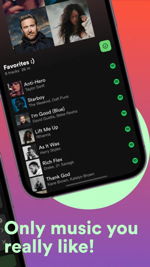 Filter Beats for Spotify creates playlists with a few clicks in seconds. Filters will help you to find the music you like out of the whole range of Spotify titles. You can chose one filter or combine them.