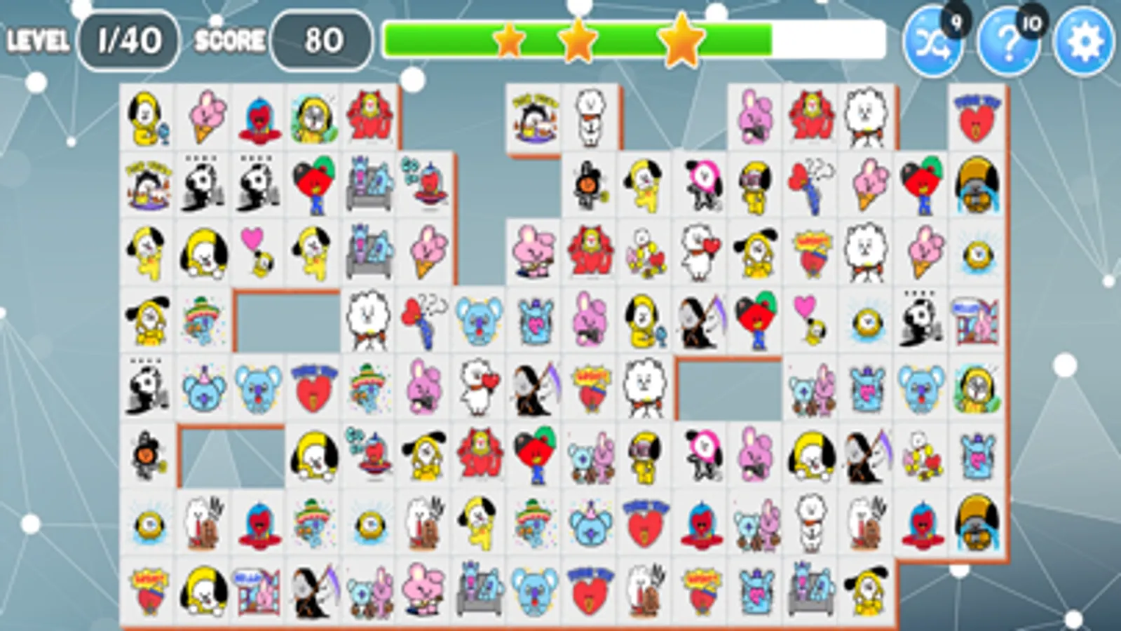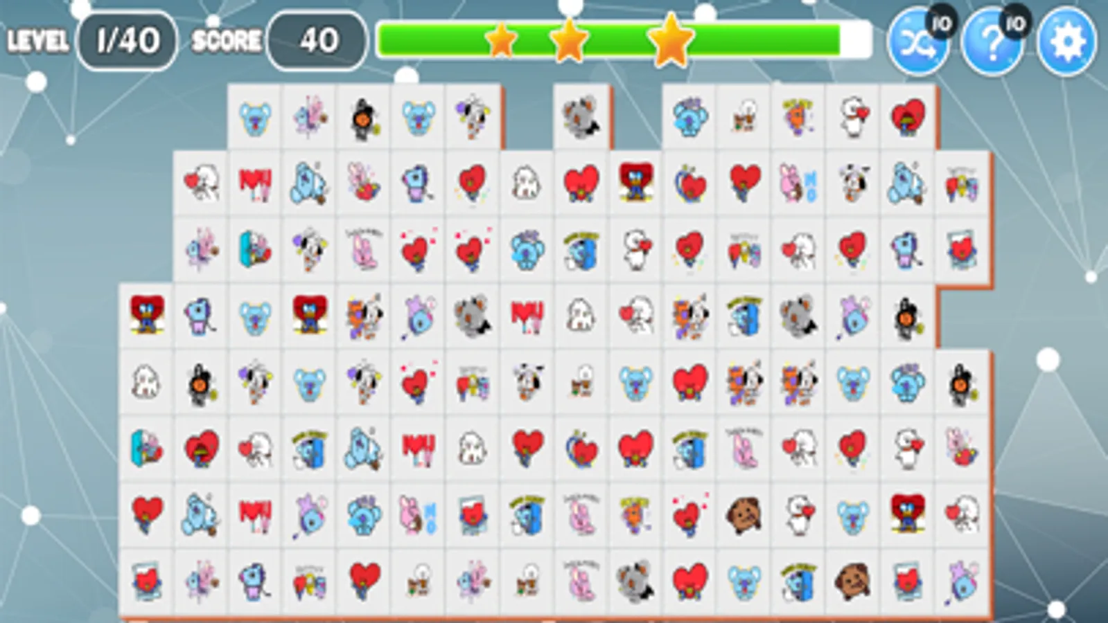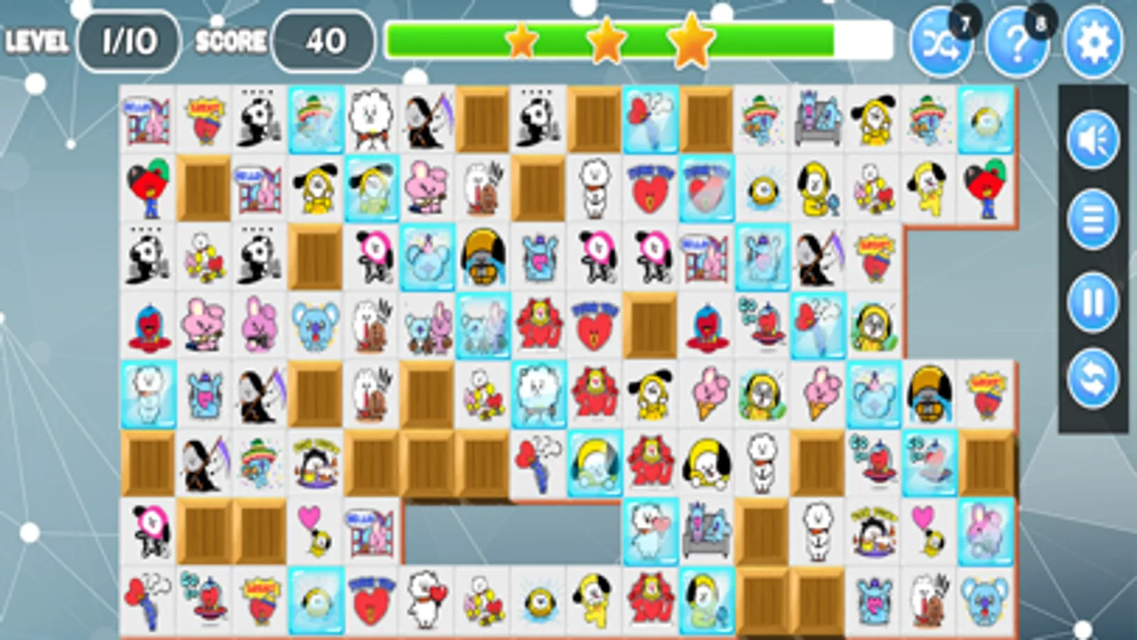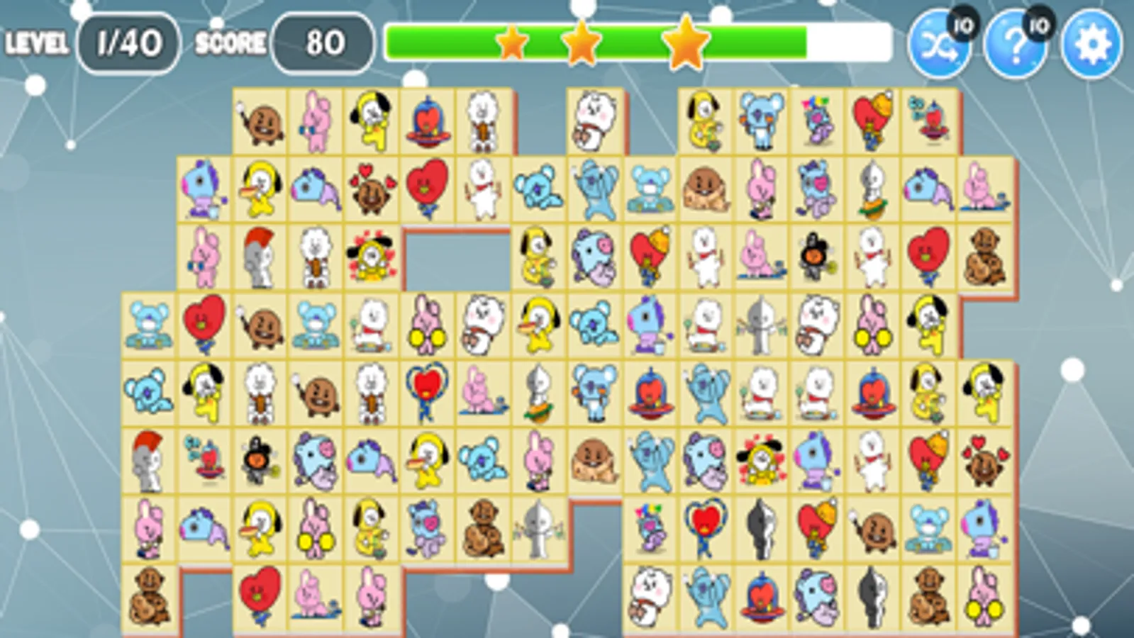 BTS BT21 Onet Connect game has 16x8 squares. Each box is a BT21 image of a BTS member. Just connect 2 squares of the same shape to score points and your score will increase rapidly as you connect more shapes. How many levels can you play? It's not an easy task!