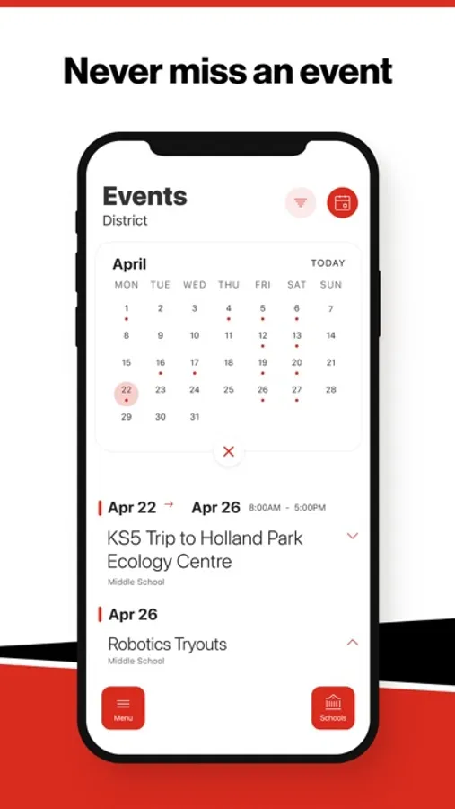The event section shows a list of events throughout the district. Users can add an event to their calendar to share the event with friends and family with one tap.