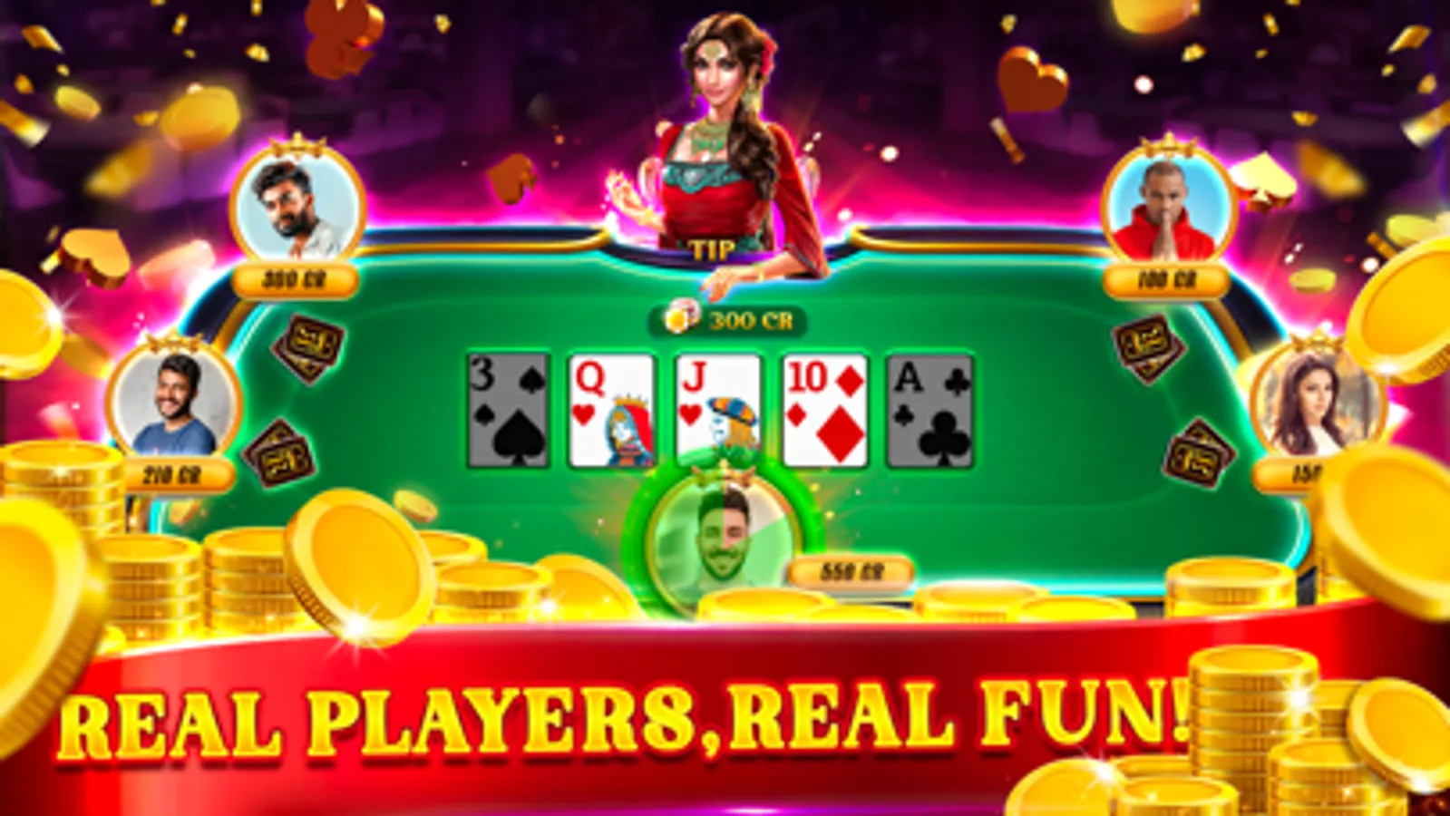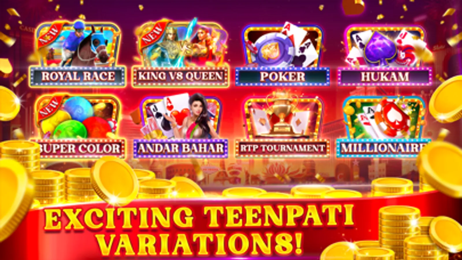 Play Teen patti, Andar Bahar, poker & 3 patti variations like Joker, Triplets, Pot Blind, Hukum, Muflis on Royal Teen patti