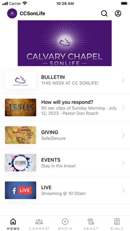 This app will help you stay connected with the day-to-day life of Calvary Chapel SonLife. With this app you can: watch or listen to past messages; stay up to date with push notifications; share your favorite messages via Facebook, Instagram or email; and download messages for offline listening. You can listen to the Bible in a Year, give online and search upcoming events or regular calendar events without ever logging in to a computer desktop. All of the relevant information at your fingertips.