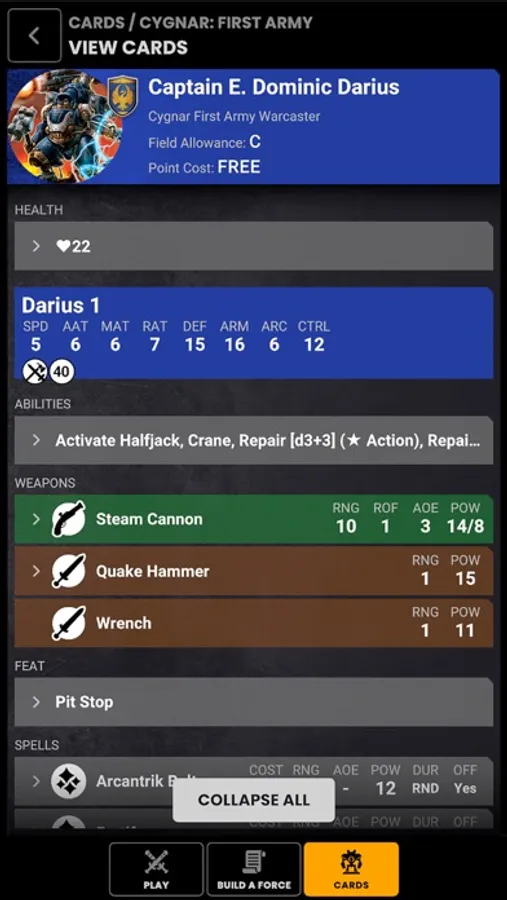 The Warmachine App is the official utility app for the WARMACHINE MKIV tabletop miniatures game. The entire library of WARMACHINE cards is in the palms of players’ hands, giving them access to a wealth of features that facilitate faster and easier gameplay. In addition, users receive regular rules updates from Privateer Press straight to their devices.