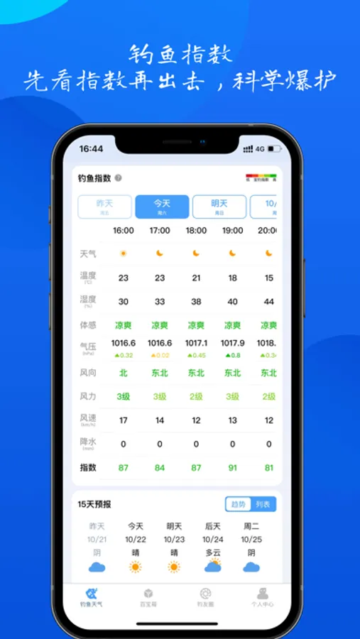 钓鱼天气/钓鱼指数功能是基于钓点位置的钓鱼天气查询工具,精确到钓位!综合了钓点的天气、温度、气压、湿度、风速、风向、降水、月相等10+项鱼儿活跃相关因素经过智能算法输出的逐小时、逐天(24小时X14天)钓鱼指数,参照钓鱼指数可以让您更加简单的成为钓鱼高手,次次爆护。