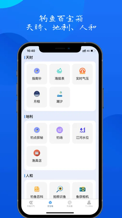 地利:钓点探秘、钓场查询、全国江河水位、渔具店查询