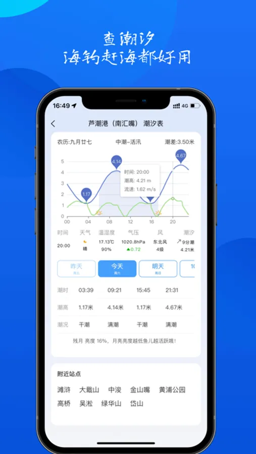 出门野钓掌握各种户外活动所需数据,实时气压监控气压实际变化,全国300+潮汐观测点,一键查询潮况,何时涨落潮、潮水流速一目了然,矶钓海钓赶海好帮手,祝您出行愉快!
