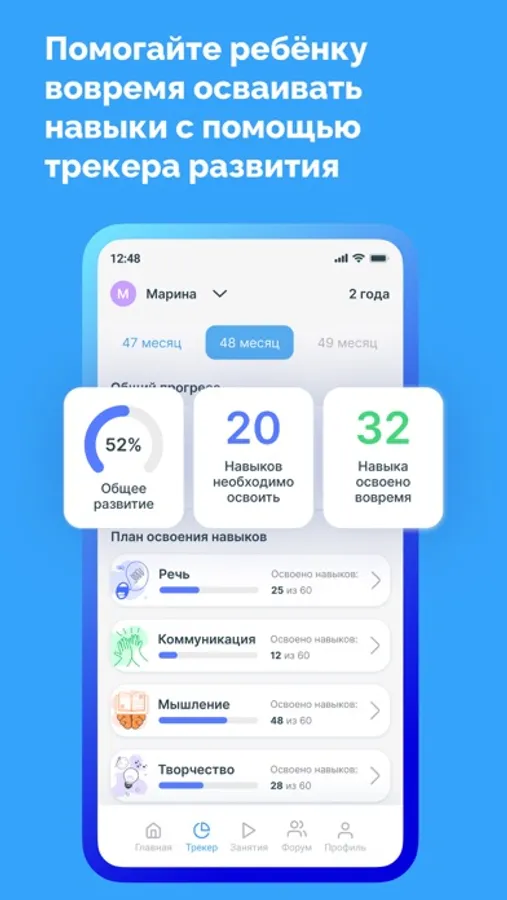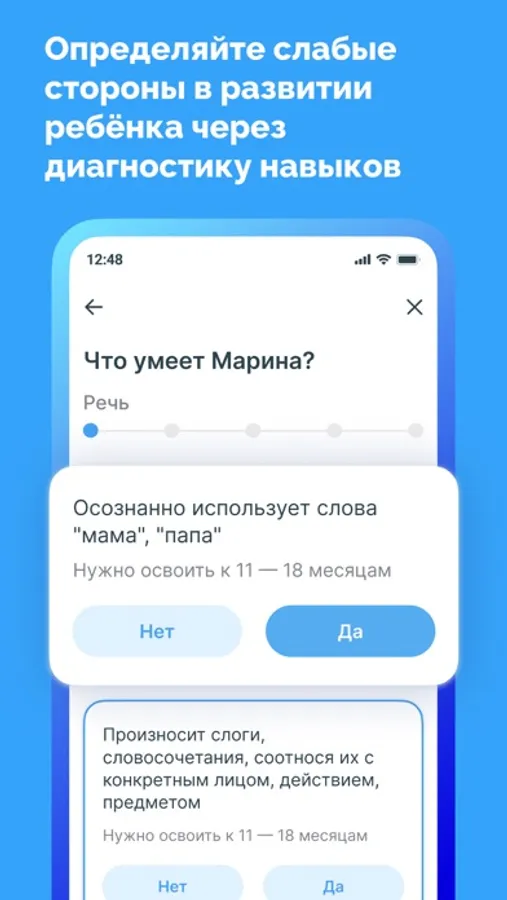 Легко и наглядно отслеживайте динамику развития ребёнка на разных этапах от 2 месяцев до 7 лет.