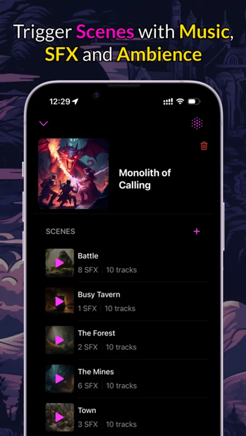 Crafting an epic campaign has never been easier - Summoning Stone lets you create and manage campaigns effortlessly. The intuitive interface and easy-to-use tools make it accessible for RPG enthusiasts of all experience levels. Organize your sounds, music, and ambience into scenes for quick access, and easily switch between different scenes to enhance your game's atmosphere. Go from a cozy tavern interior to a fight in the snow outside.