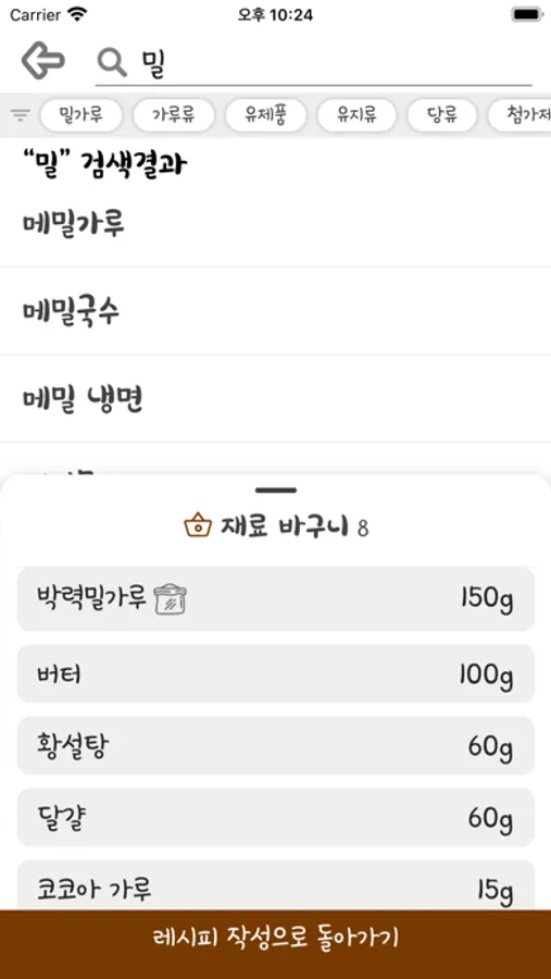 - 재료를 검색해 레시피를 작성 저장