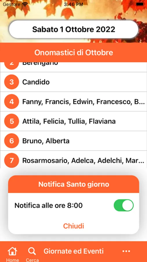 Possibile attivare la notifica degli Onomastici ad orario scelto dall'utente, orario unico valido per tutte le notifiche Onomastici attivate.