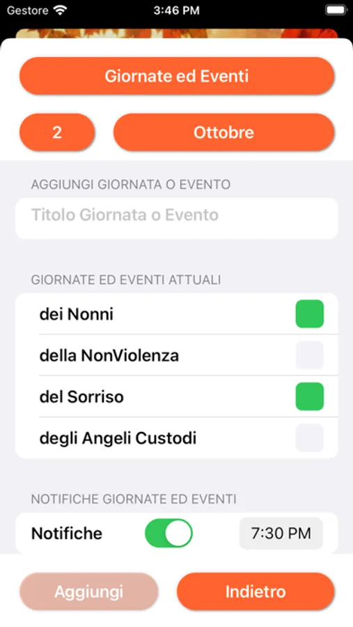 Possibile attivare la notifica delle Giornate ed Eventi ad orario scelto dall'utente, orario unico valido per tutte le notifiche attivate.