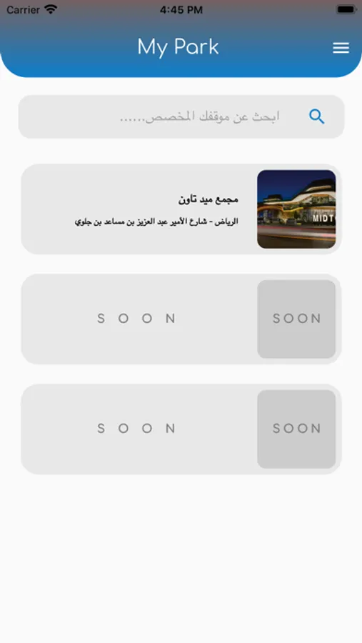 ماي بارك تطبيق الكــتروني يعمــل مــن خــلال الأجهــزة الذكيــة يســاعد المســتخدمين للحصــول عــلى موقــف خــاص بمركباتهــم مــن خــلال حجــز موقـف مخصـص للمركبـة وفـق مـدة زمنيـة مختـارة ومحـددة وبسـعر محـدد قبـل الوصـول إلى الموقـف مــع وجــود خيــارات ســداد ســهلة وآمنــة , كل ذلك من خلال تطبيق ماي بارك لتحقيق المدن الذكية والاستفادة من التطبيق كفرد و كمجتمع.