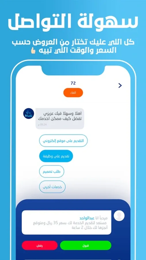 بتحميلك للتطبيق يمكنك اختيار من ينفذ طلباتك في مجال الخدمات المصغّرة بشكل مباشر، وعمل التصاميم والأعمال المكتبية بكافة أنواعها، وحسب السعر ومدة التنفيذ المناسبة لك.