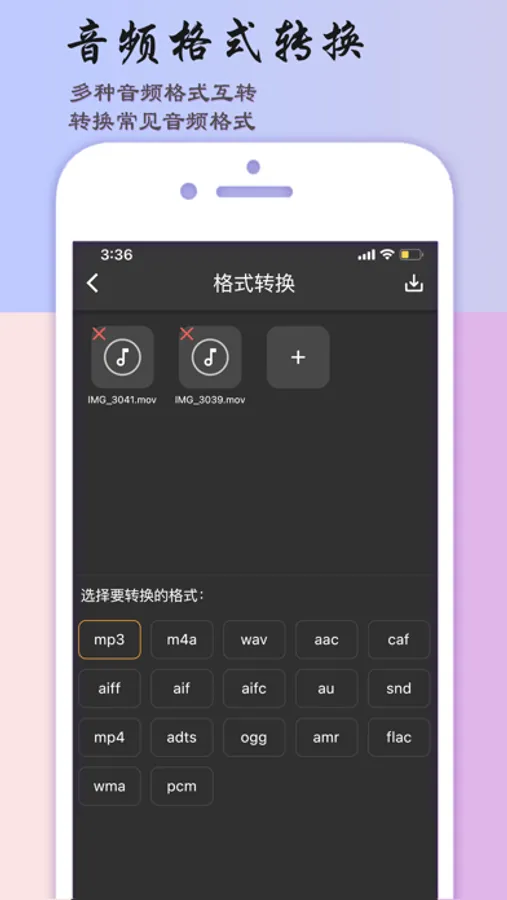 4,格式转换-提供十多种常见音频格式的相互转换功能,比如mp3、m4a、aac、wav、aiff、aif、ogg、amr、flac、pcm以及wmv等等10多种常见音频格式的互转功能。让你不再为不能播放音频而烦恼。