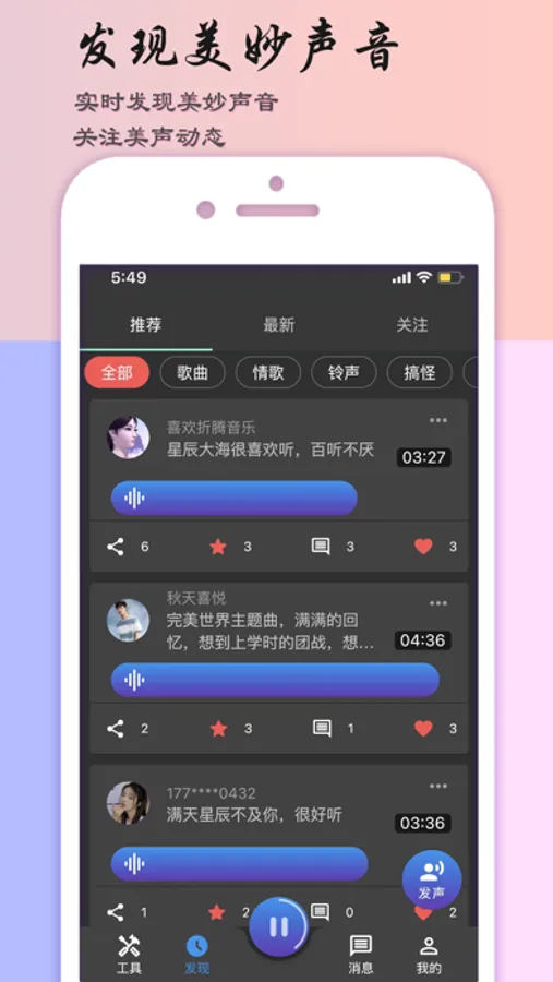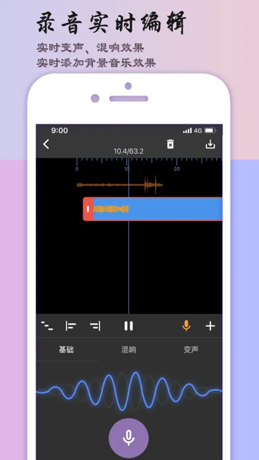 2,声音变声-提供音频变声功能,可以变为萝莉音、大叔音、惊悚、搞怪、空灵、机器人声的多种效果。