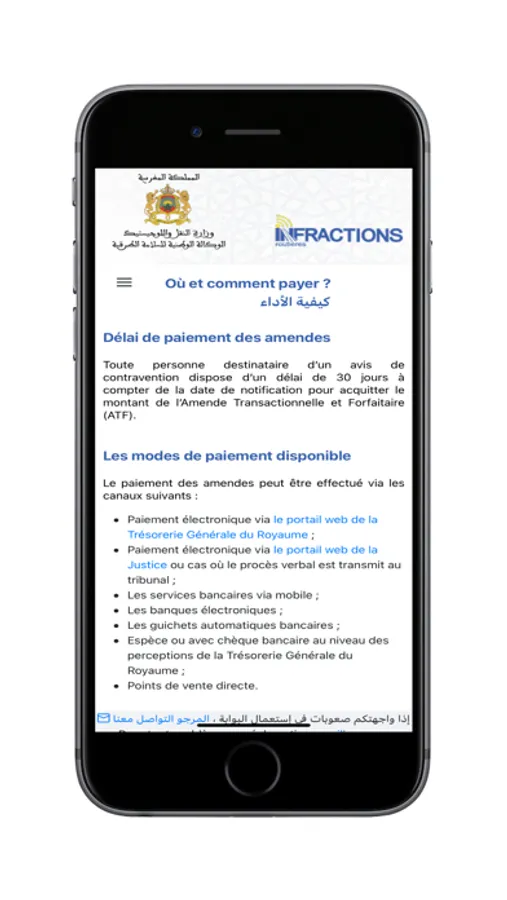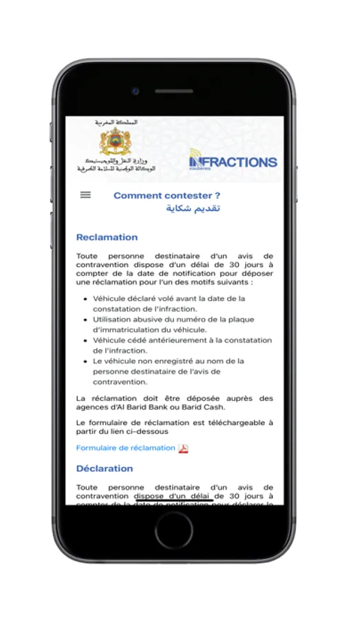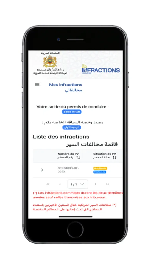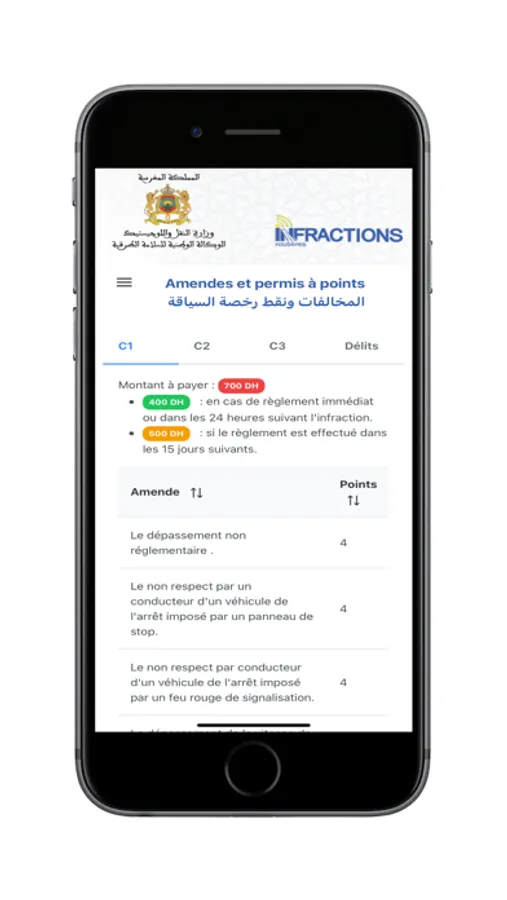 L'application «INFRACTIONS ROUTIÈRES» permet, à tous les citoyens marocains, les résidents étrangers au Maroc ainsi qu’aux touristes étrangers conduisant un véhicule immatriculé au Maroc, une consultation simple et rapide des éventuelles infractions commises.