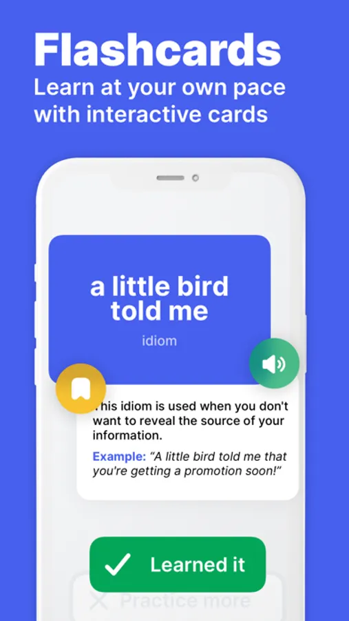 Learn from more than 1,300 essential English idioms carefully picked by expert tutors. Use the Smart Round for personalised flashcards generated by our learning algorithm.