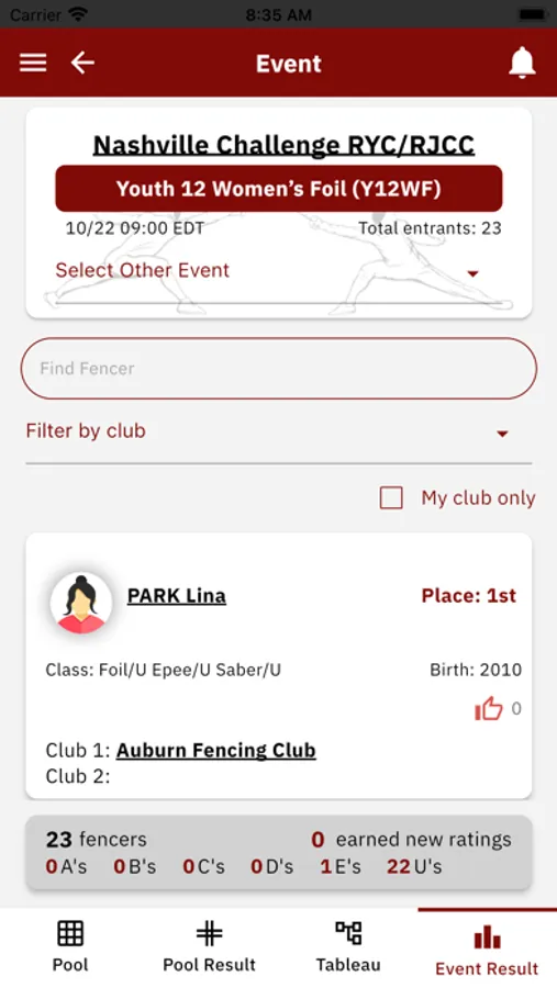 Fencing One is dedicated to making fencing as a competitive sport much more enjoyable! It helps parents, coaches and fencers stay on top of all tournaments and events. It provides user friendly interface to allow users to navigate smoothly among fencer data, tournament information, event results, and club information. With the app, all the data is right at your fingertip. Users can also "like" tournaments when they have enjoyable experience, or give thumbs up to fencers who did their best. More pleasant surprises inside.