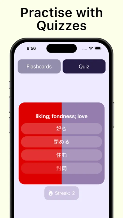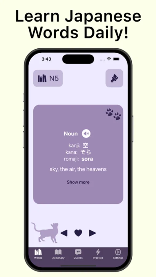 Do you want to learn new Japanese words daily and practice with flashcards and quizzes? With the help of our app, you can achieve these goals! The application provides Japanese words and grammars according to JLPT levels with their definition, pronunciation, how to write it in Kanji, Kana and Romaji, complex examples, and more.