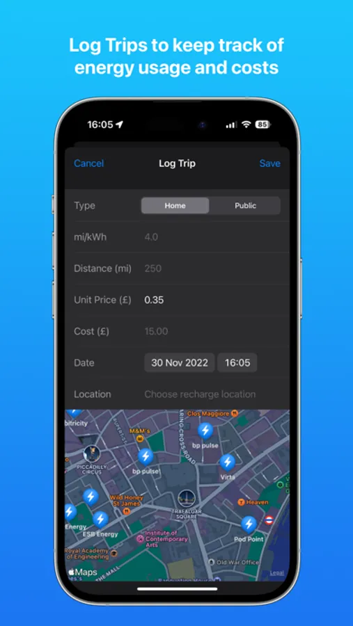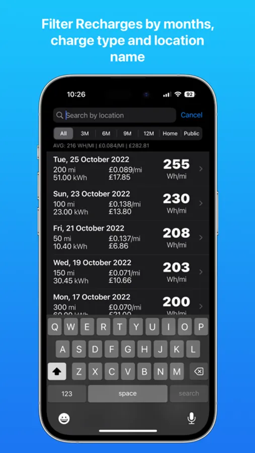 Filter recharges by months, location, and home/public charger. Visualise how each trip has affected your cost per mile/km, consumption and overall cost.
