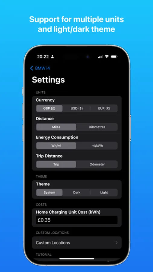 Supports a variety of different units, multiple vehicles, custom locations and all data is synced to iCloud and accessible on another device signed in on the same account.