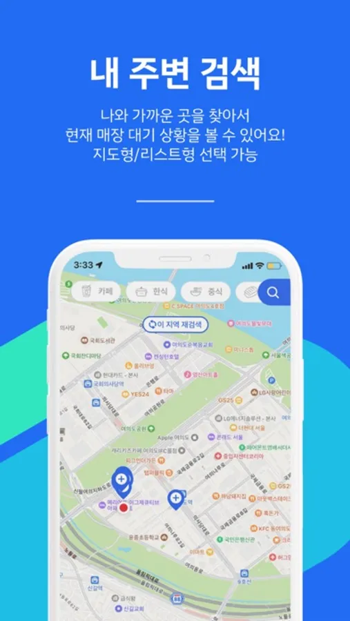 현재 나의 위치 100m 이내에 있는 매장들의 대기몇명 정보를 확인할 수 있습니다.