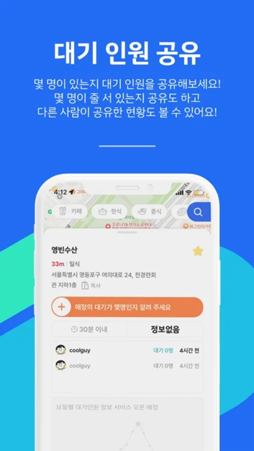 사람들과의 커뮤니케이션! 현재 자신이 위치한 매장에 대기하고 있는 전체 대기 인원 수에 대한 정보를 다른 사람들에게 공유할 수 있습니다. 더 많은 곳을 공유하고 소소한 재미인 '업적'도 달성해 보세요!