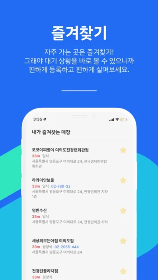 인기 있는 매장의 현재 대기 인원 수 정보를 나만의 리스트로 만들어서 한눈에 확인할 수 있어요 :-)