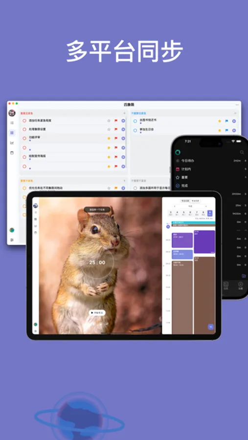 - 多平台同步:支持云端同步。可从手机、平板、电脑等设备随时随地查看和安排日程。也可控制另一设备的专注进入休息。