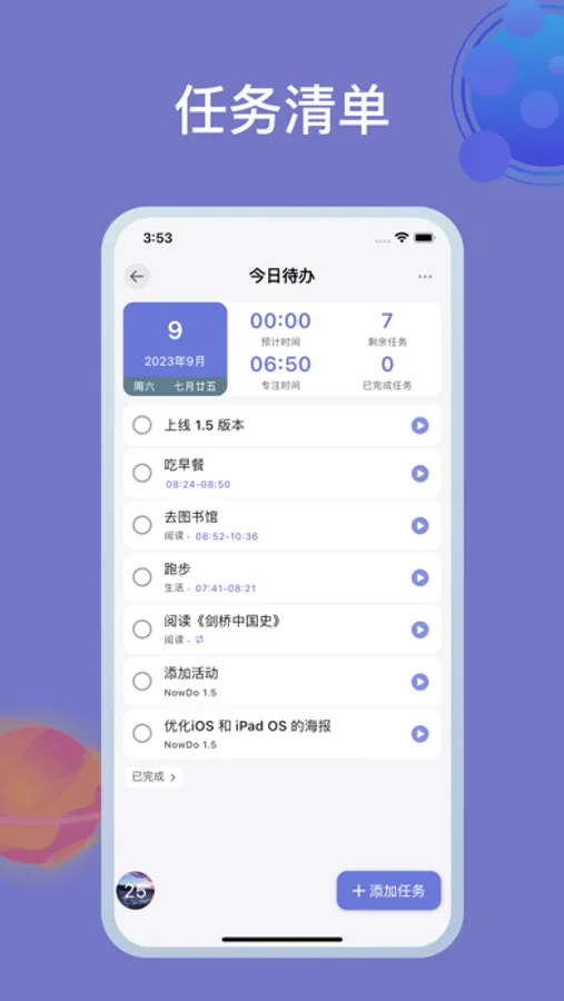 当你面对繁琐的日程安排和待办事项时感到无所适从,或因时间的流逝而感到焦虑时,NowDo可能会对你有所帮助。NowDo可以无缝融合你的任务和事件,全方位展现每项任务的计划时间及其消耗时间。