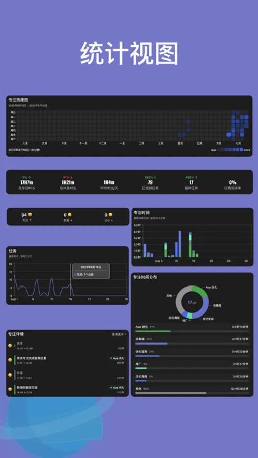 - 报表:记录所有的专注时间和任务,帮助你看到每一点滴改变。
