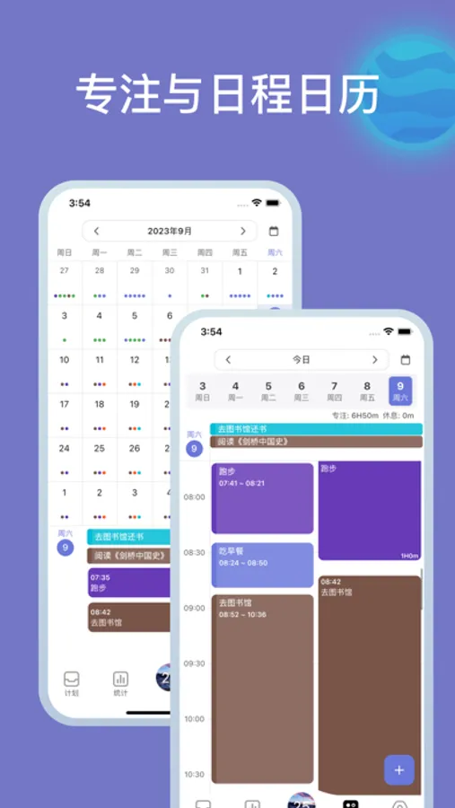 - 日历视图:在直观的日历视图中查看日程计划和专注记录,拖动卡片即可实现日程和专注时间管理。