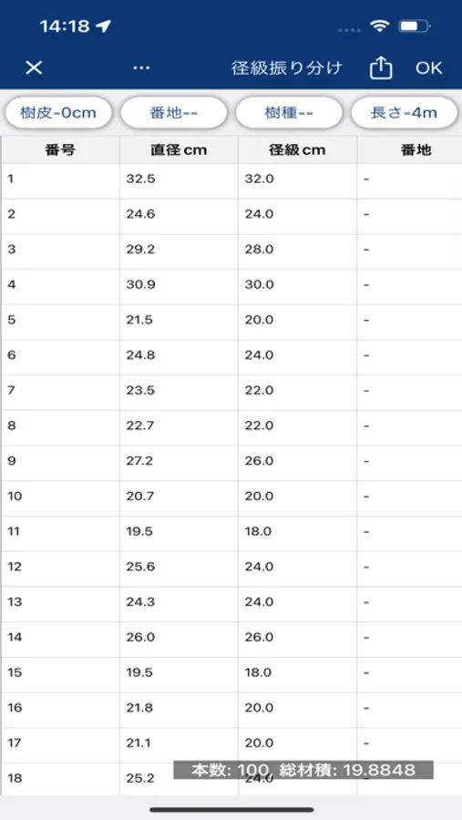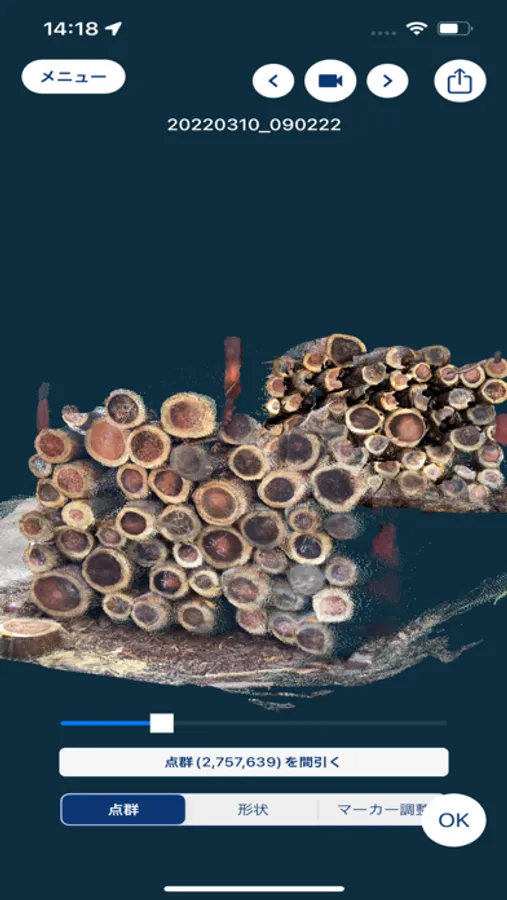 また、スキャン時には木材の丸太を自動で検出でき、保存した点群を使用して丸太の径級データを表示・編集することができます。