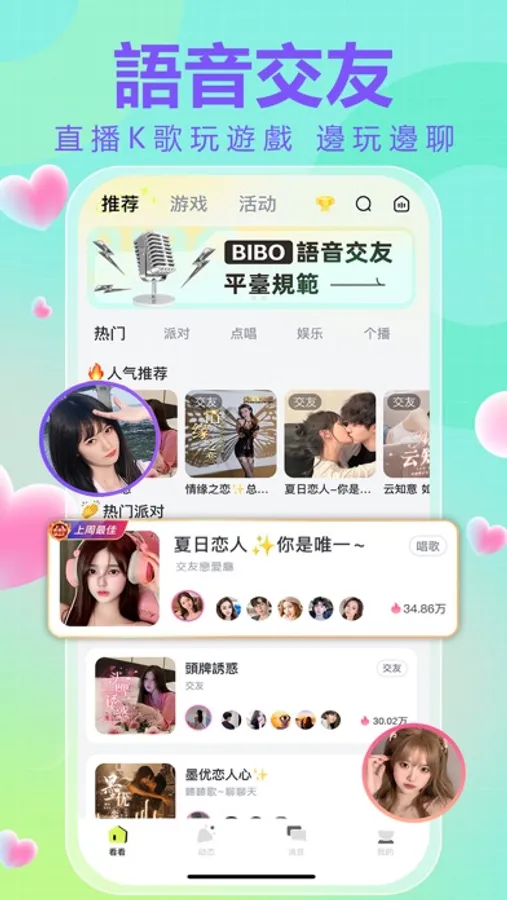 Bibo--是年輕人都愛玩的語音社交APP。這裏是年輕人娛樂交友的聚集地,這裏有有趣直播、語音交友、超多小遊戲、K歌聼歌,爲妳帶來精彩24小時無間斷娛樂!