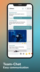 • TEAM CHAT: You can also use the app's chat function outside of operations. For 1:1 conversations, communication in individual groups or in the entire emergency organization.